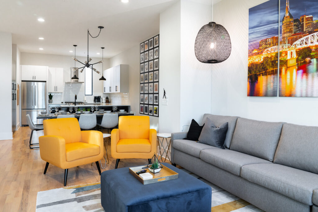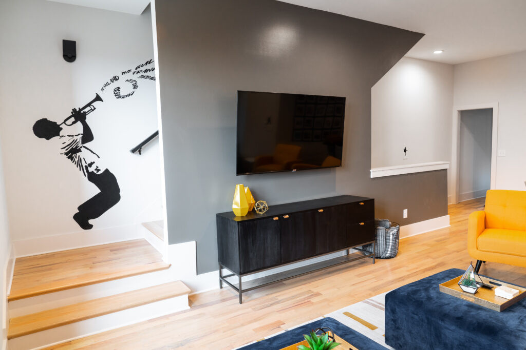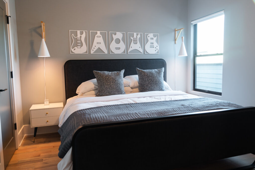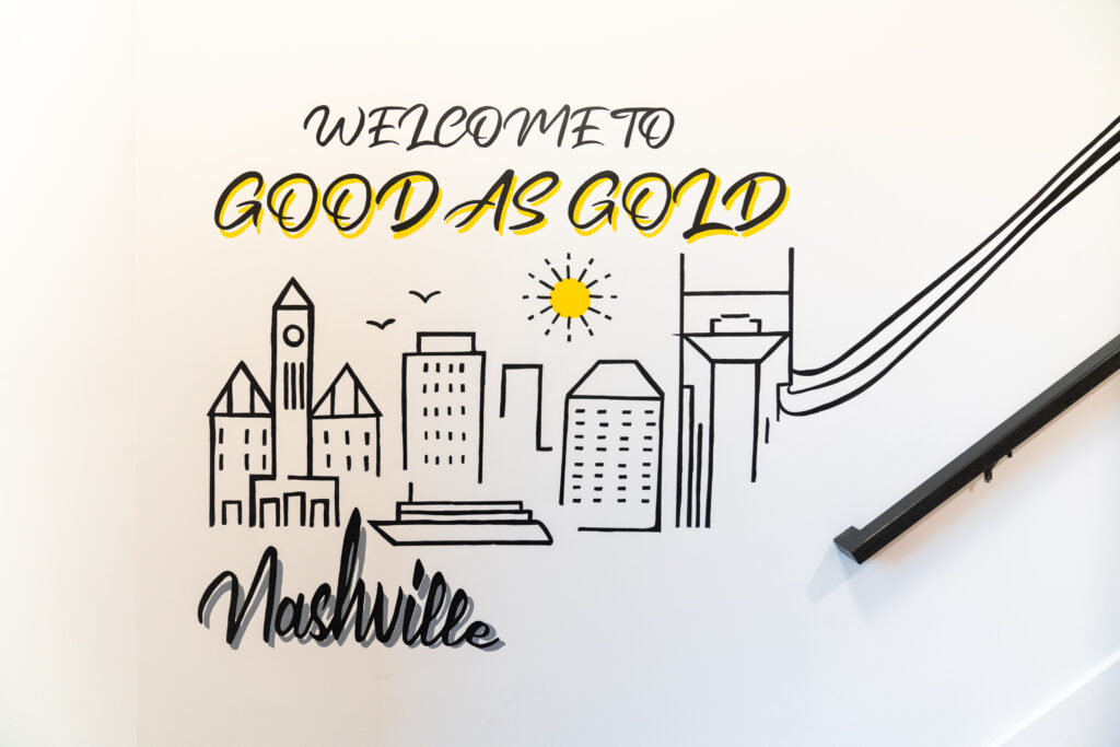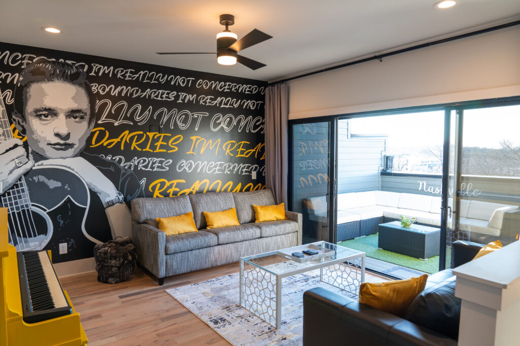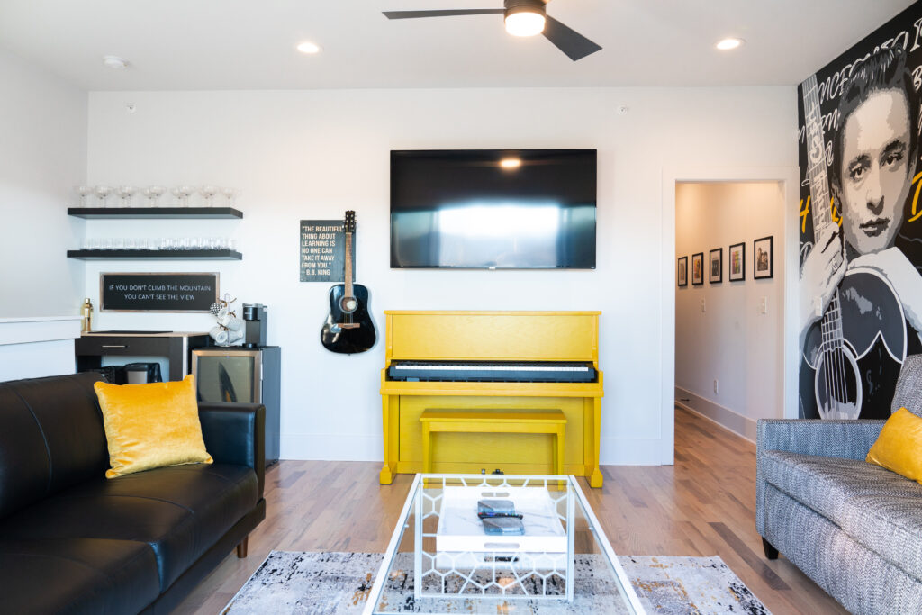 Built in 2021, Good as Gold Rowhouse is crafted with luxury and comfort in mind, perfect for large groups. Guests often immerse themselves in Nashville’s vibrant nightlife and dining scene, conveniently located nearby. For those who prefer to stay in, the home features a fully equipped kitchen, expansive living areas with plush sofas, and a top-floor lounge with an outdoor deck for stunning sunset views. Enjoy a unique musical experience with our bright yellow piano, large murals, and musical decor throughout the space.