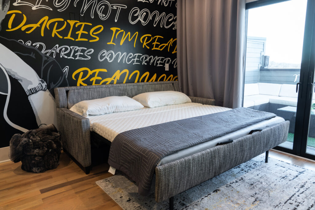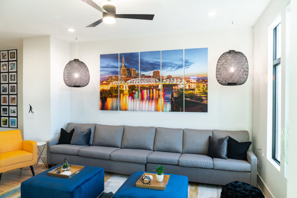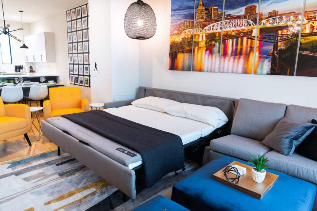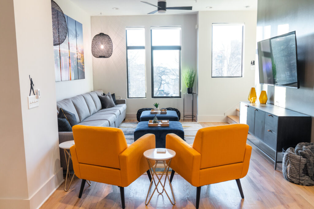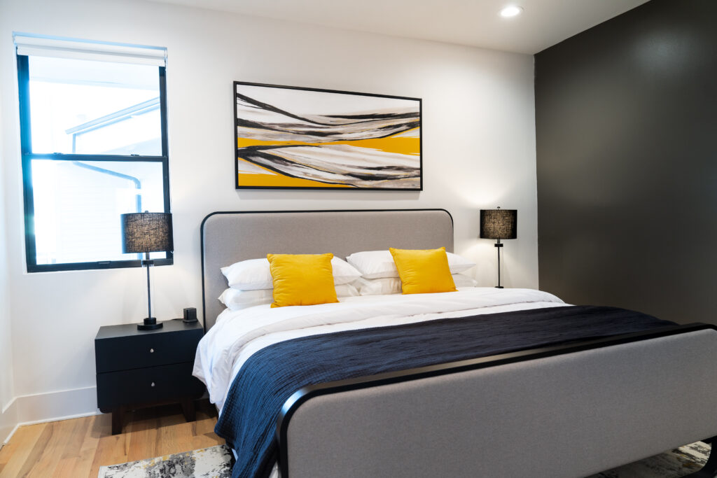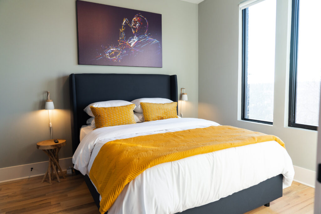 Built in 2021, Good as Gold Rowhouse is crafted with luxury and comfort in mind, perfect for large groups. Guests often immerse themselves in Nashville’s vibrant nightlife and dining scene, conveniently located nearby. For those who prefer to stay in, the home features a fully equipped kitchen, expansive living areas with plush sofas, and a top-floor lounge with an outdoor deck for stunning sunset views. Enjoy a unique musical experience with our bright yellow piano, large murals, and musical decor throughout the space.