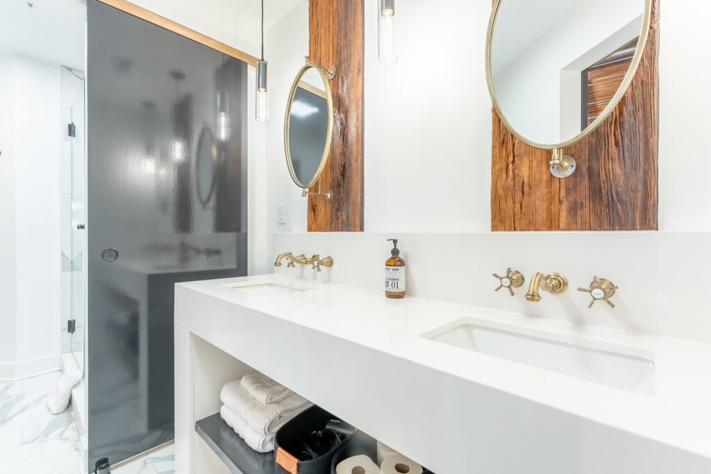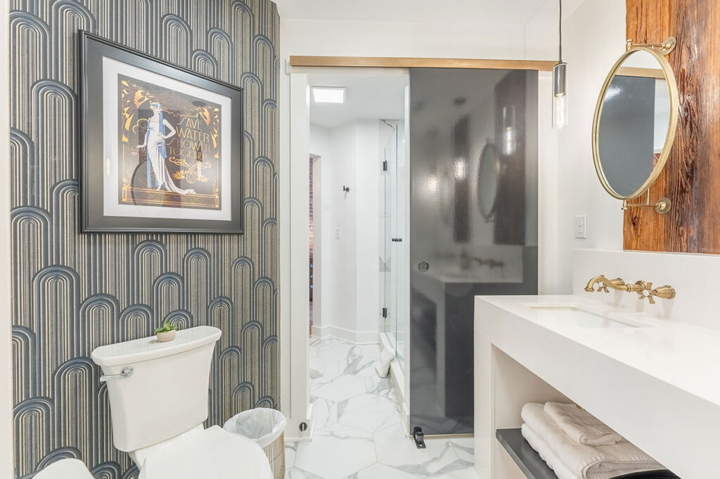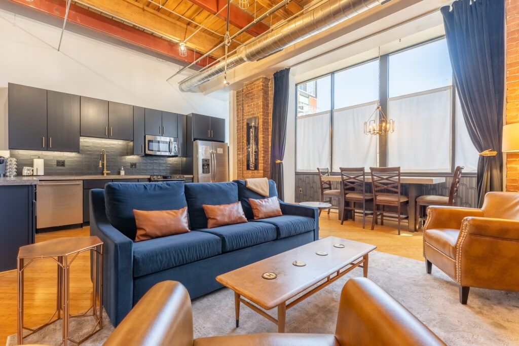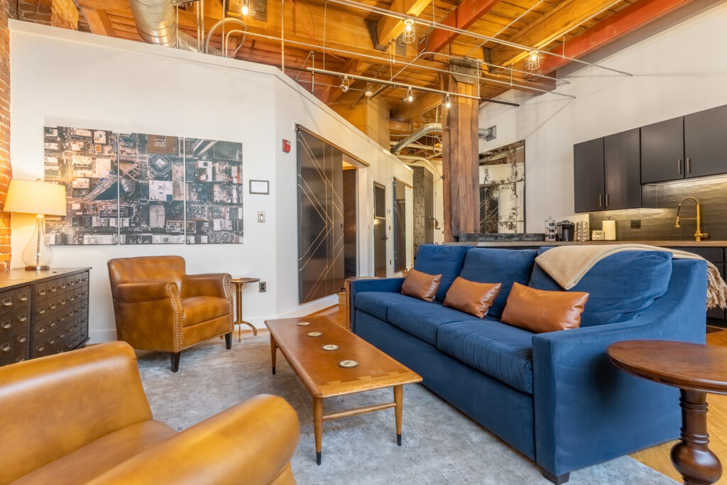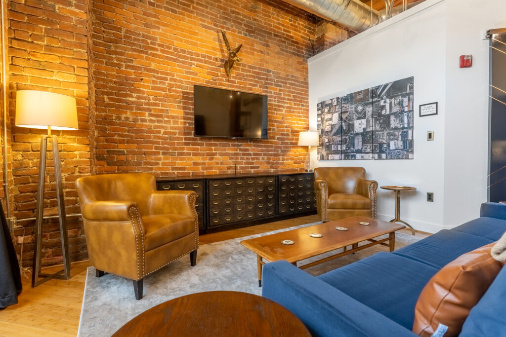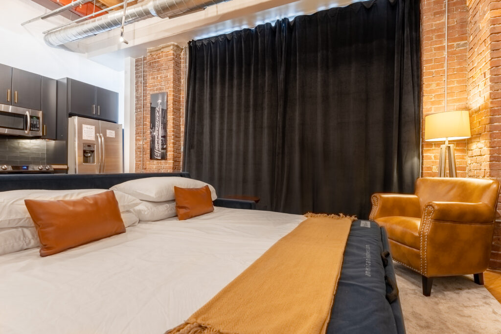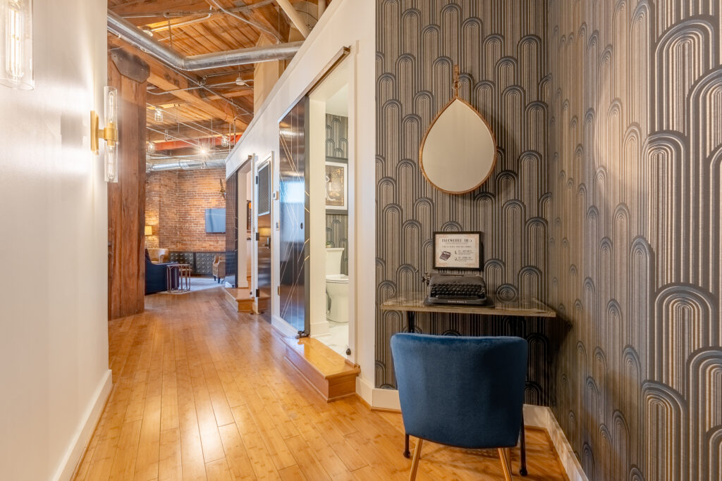 Welcome to our unique Art Deco, industrial loft located in downtown Nashville. Housed within a historic 1905 industrial warehouse, Letterpress Loft offers a blend of historic charm and modern luxury. Inside, you’ll find soaring ceilings with wooden columns, showcasing the building’s rich history as a commercial printing company. Original brick walls and industrial ductwork add character to the space, creating a nostalgic atmosphere. While embracing its past, the loft also offers modern conveniences such as secure electronic door locks, high-speed WiFi, and Smart TVs for your entertainment. Every corner of the loft is thoughtfully designed, with a luxurious bathroom featuring antique brass rainwater showerheads and a double vanity. The bedroom offers a king-sized Helix mattress and high-end linens. Additional guests can enjoy the comfort of a king-sized luxury sofa bed in the living area. Throughout the loft, you’ll find delightful Art Deco and industrial touches, adding a touch of whimsy and charm. A vintage 1946 typewriter allows you to leave your mark in our guestbook. Be sure to read our FAQ’s below to ensure this stay is the right place for you.